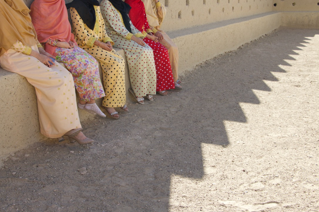In this photograph, a row of women sit quietly along the earthen walls of a traditional fort, their dresses patterned with playful polka dots and florals, their presence both vibrant and understated. The sharp shadows of the fort’s battlements stretch across the ground like a rhythm of history, juxtaposed with the softness of fabric and gesture.