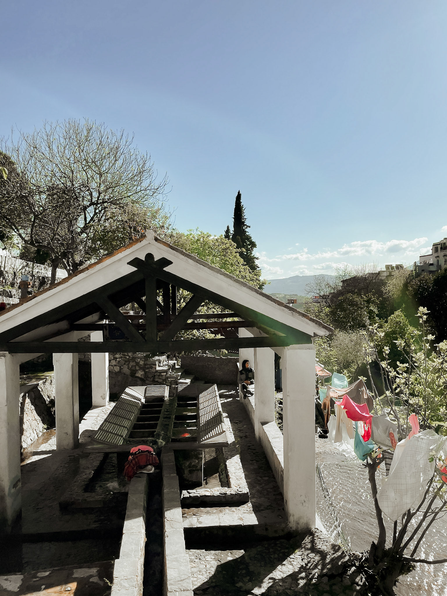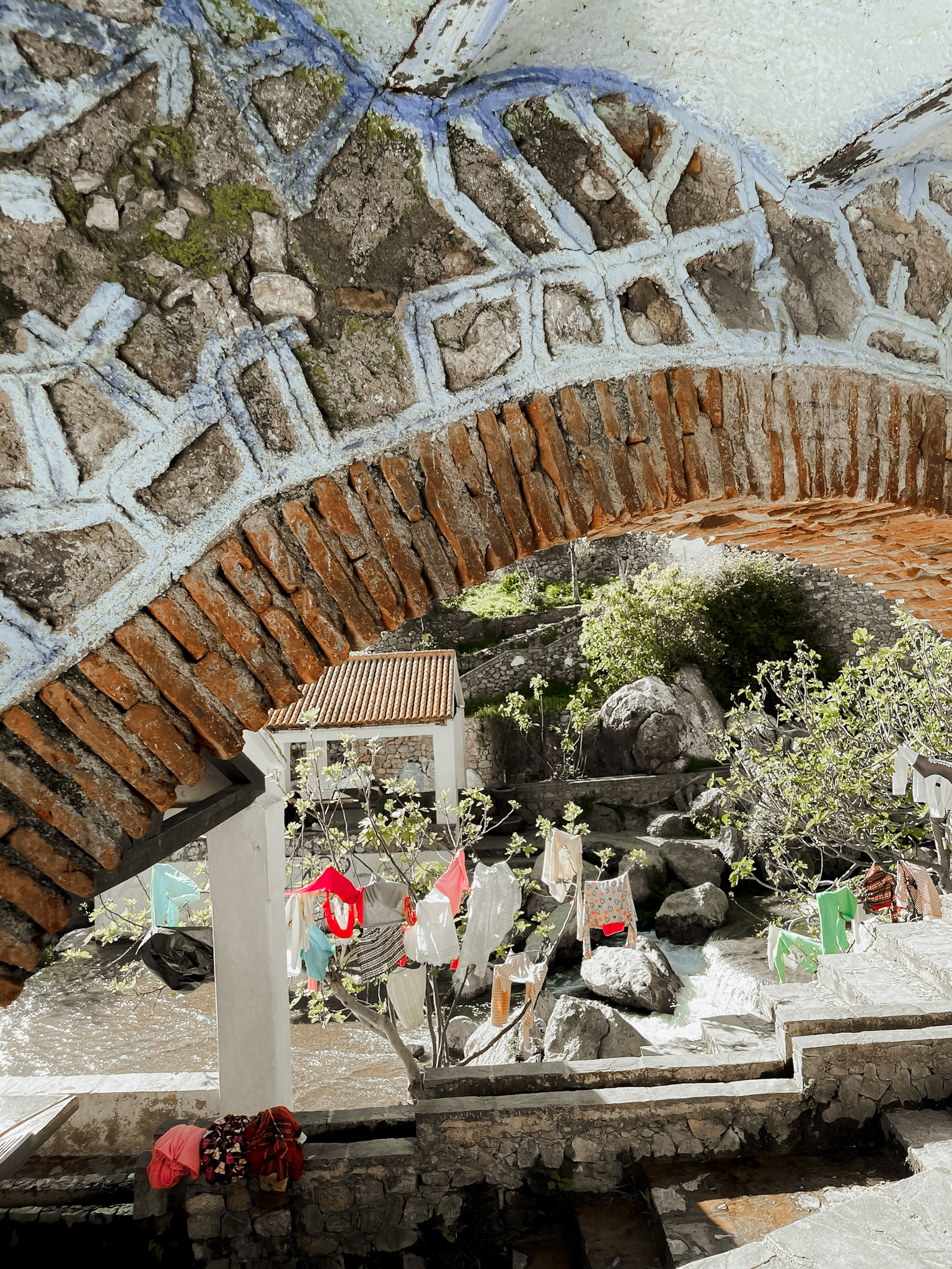 Beneath the arch of hand-laid brick and stone, the landscape breathes with human touch—laundry suspended like flags, fabric strung across trees and stairways. These garments, caught between air and water, are offerings of daily ritual. They transform the natural world into a gallery of color, memory, and resilience, as if the trees themselves wear stories.