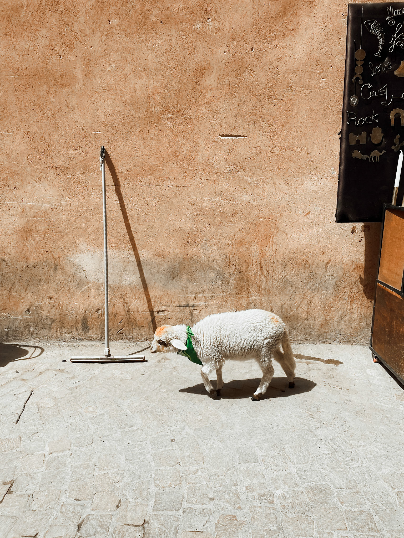 A lamb wanders against a sun-washed wall, its wool echoing the texture of the plaster, its presence both fragile and eternal. This quiet scene becomes a meditation on innocence and survival, a dialogue between shadow and sun.