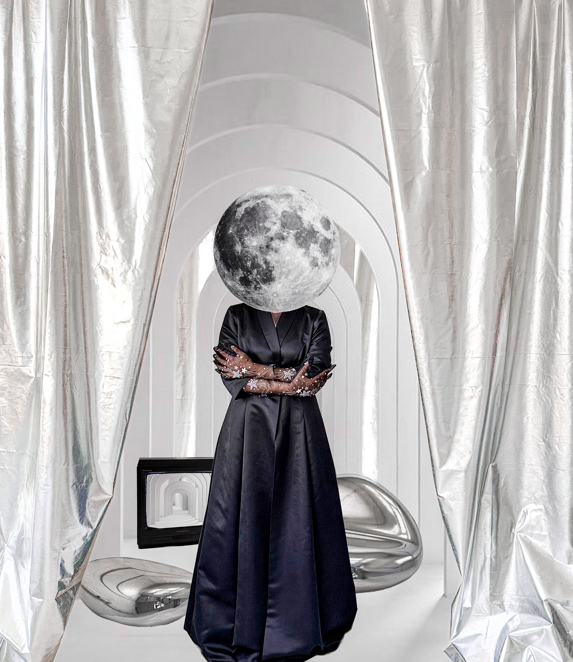 Bathed in silver, Moon City is a celestial sanctuary. A queen stands cloaked in black, her head transformed into a full moon, radiating stillness and mystery. The mirrored arches and metallic forms evoke the echo of eternity an endless architecture of light and shadow. This is a city of silence, reflection, and cosmic rhythm.