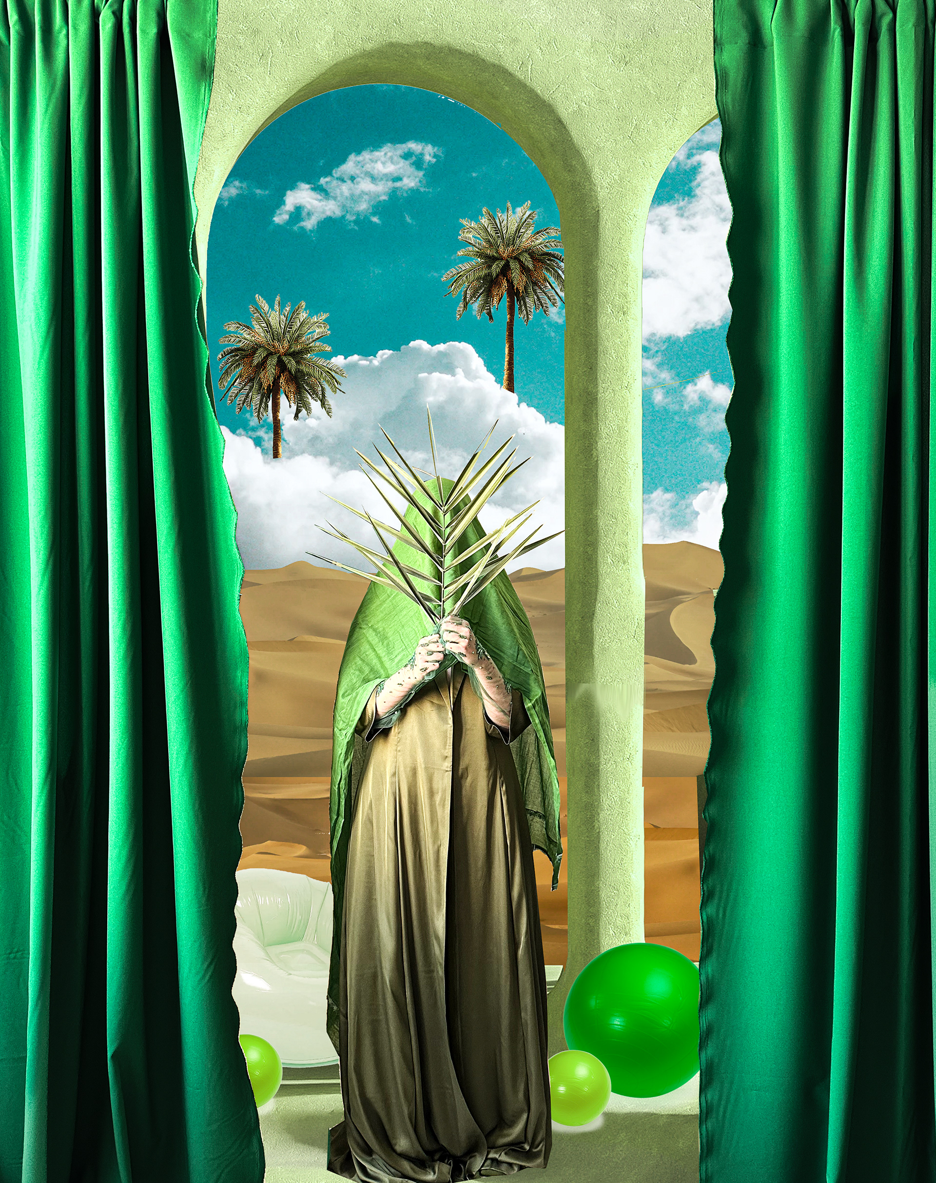 Here, the desert blooms with life. Beneath green curtains, the queen cloaks herself in palm leaves, embodying nature’s grace and resilience. The oasis beyond the arches conjures memory and heritage the timeless connection between people and land. Emerald City is a place of renewal and rootedness, where tradition thrives beneath an infinite desert sky.